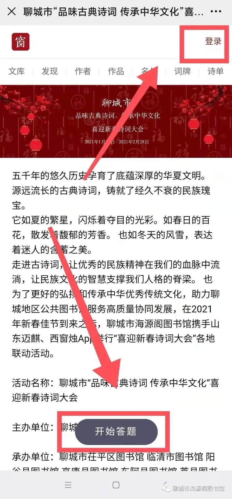 组织机构 主办单位:聊城市海源阁图书馆 承办单位:聊城市茌平区图书馆 临清市图书馆 阳谷县图书馆 高唐县图书馆 东阿县图书馆 冠县图书馆 莘县图书馆 活动时间 2021年1月26日 —2021年 2月28日 活动对象 诗词爱好者 参与方式