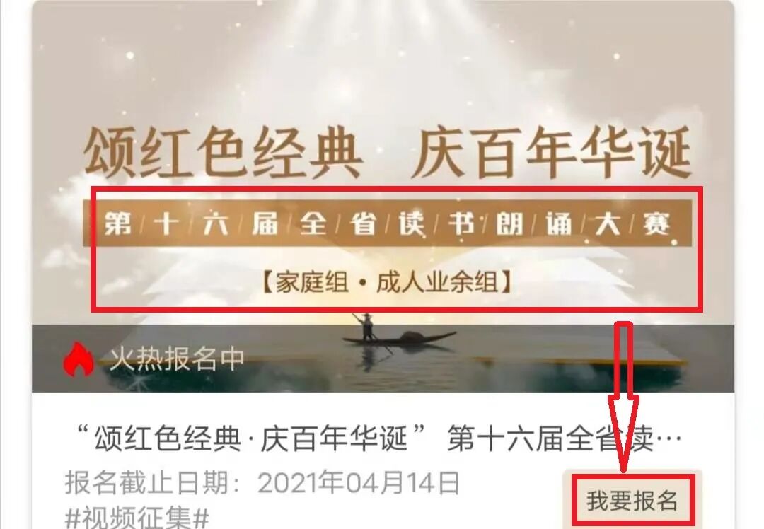 颂红色经典·迎百年华诞 主办单位:中共高唐县委宣传部 高唐县文化和旅游局 承办单位: 高唐县图书馆 本届大赛采取线上、线下相结合的方式:线上初赛,线下决赛。县初赛与省初赛同步,在山东公共文化云平台进行。 (一)大赛分组 本届读书朗诵大赛比赛设家庭组和成人业余组两个组别。 (二)作品要求 参赛作品应符合大赛主题要求,内容积极向上,鼓励原创。作品体裁不限,诗歌、散文、小说或剧目节选等均可。参加决赛的作品朗诵时间不超过五分钟,如需配乐可自选。家庭组为家庭成员组合参赛,成人业余组组合人数不得超过三人。 参赛选手需将参赛视频发送邮箱gtxtsg3981967@163.com,以备初选,文件名为“姓名+作品名称”,作品时长不超过5分钟,大小不超过500M,格式为MP4。(报名时请注明参赛组别、人数、作品名称、姓名、性别、年龄、出生年月、单位、联系电话、朗诵体裁)。 联系电话:0635-3981967 报名截止时间:2021年4月13日16:00。 本次大赛设一等奖1名,二等奖3名,三等奖5名,优秀奖若干。根据各单位组织发动和参赛成绩等,设立优秀组织奖,由主办方进行颁奖。 附件:1.关于举办高唐县第五届读书朗诵大赛的通知 2.读书朗诵大赛报名指南 中共高唐县委宣传部 高唐县文化和旅游局 2021年3月30日 附件1:关于举办高唐县第五届读书朗诵大赛的通知 附件2:读书朗诵大赛报名指南 参赛方法: 第一步:扫码关注高唐县图书馆微信公众号 第二步:进入高唐县图书馆微信公众平台,点击在线平台 第三步:点击汇文鲁云 第四步:找到本次【第十六届全省读书朗诵大赛家庭组.成人业余组】点击“我要报名” 第五步:点击“立即报名”即可