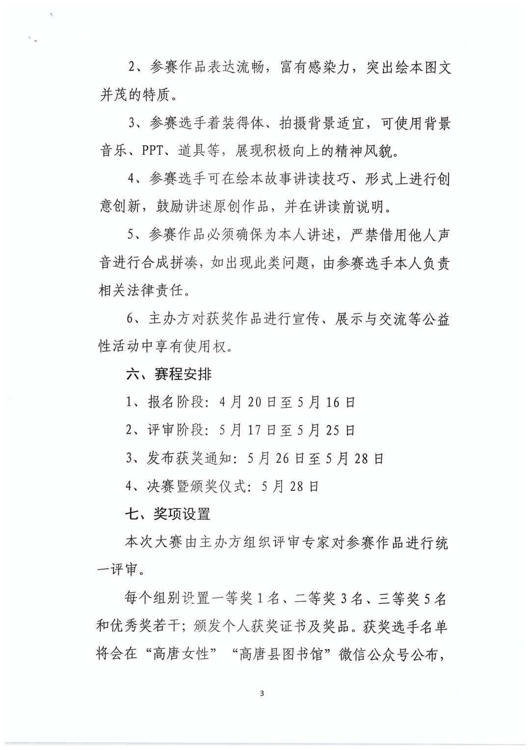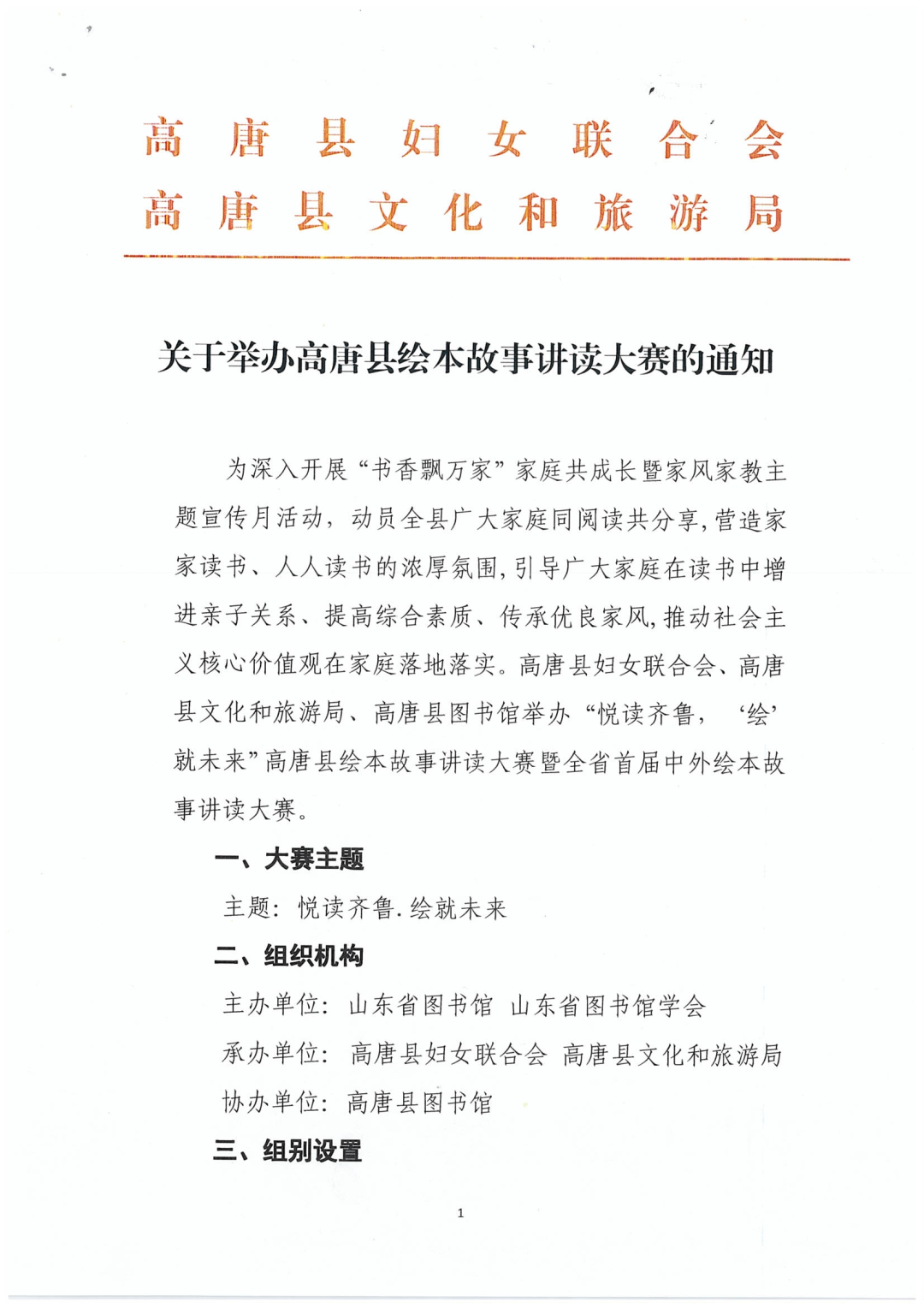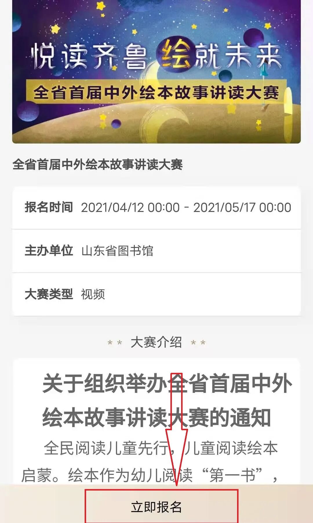 大赛简介 为深入开展“书香飘万家”家庭共成长暨家风家教主题宣传月活动,动员全县广大家庭同阅读共分享,营造家家读书、人人读书的浓厚氛围,引导广大家庭在读书中增进亲子关系、提高综合素质、传承优良家风,推动社会主义核心价值观在家庭落地落实。高唐县妇女联合会、高唐县文化和旅游局、高唐县图书馆举办“悦读齐鲁,‘绘’就未来”高唐县绘本故事讲读大赛暨全省首届中外绘本故事讲读大赛。 大赛主题 悦读齐鲁·绘就未来 组织机构 主办单位:山东省图书馆 山东省图书馆学会 承办单位:高唐县妇女联合会 高唐县文化和旅游局 协办单位:高唐县图书馆 组别设置 本次大赛为公益活动,不收取任何参赛费用,共设两个组别。 1.儿童工作者组 (幼儿园、中小学教育工作者、高校师生、绘本行业从业者等) 2.家庭组 (家长+孩子,或家长单独报名) 报名须知 1、报名要求 (1)每个参赛选手只能选取一个上传端口、一个组别报名,不允许交叉报名参赛; (2)家庭组需以家长为主讲述人进行报名(报名只提供家长信息)。 2、报名信息内容 各组别分别提供姓名、性别、年龄(出生年月)、身份证号、单位、居住地、作品信息、联系电话、参赛视频。 3、视频格式要求 参赛作品时长不超过10分钟,最大不超过1G,格式为MP4。作品录制要求声音清楚,画面稳定清晰、避免出现过多剪辑及配音处理。 作品要求 1、参赛作品主题内容应以社会主义核心价值观为指导,健康向上,弘扬正能量,对于促进少年儿童思想道德建设、精神品格养成、阅读意识树立具有积极意义。 2、参赛作品表达流畅,富有感染力,突出绘本图文并茂的特质。 3、参赛选手着装得体、拍摄背景适宜,可使用背景音乐、PPT、道具等,展现积极向上的精神风貌。 4、参赛选手可在绘本故事讲读技巧、形式上进行创意创新,鼓励讲述原创作品,并在讲读前说明。 5、参赛作品必须确保为本人讲述,严禁借用他人声音进行合成拼凑,如出现此类问题,由参赛选手本人负责相关法律责任。 6、主办方对获奖作品进行宣传、展示与交流等公益性活动中享有使用权。 赛程安排 1、报名阶段:4月20日至5月16日 2、评审阶段:5月17日至5月25日 3、发布获奖通知:5月26日至5月28日 4、决赛暨颁奖仪式:5月28日 奖项设置 本次大赛由主办方组织评审专家对参赛作品进行统一评审。 每个组别设置一等奖1名、二等奖3名、三等奖5名和优秀奖若干;颁发个人获奖证书及奖品。 获奖选手名单将会在“高唐女性”“高唐县图书馆”微信公众号公布,并进行电话通知。 报名方式 参赛选手上传作品后请将参赛视频发送至邮箱gtxtsg3981967@163.com一份,以备初选,为保证可以与参赛选手及时联系,上传邮箱时文件名备注为“姓名+作品名称+手机号码”。 活动咨询电话: 0635-3981967 15966213619 联系人:沈馆长 附件:1.关于举办高唐县绘本故事讲读大赛的通知 2.高唐县绘本故事讲读大赛报名指南 高唐县妇女联合会 高唐县文化和旅游局 2021年4月20日 附件1:关于举办高唐县绘本故事讲读大赛的通知 附件2: 高唐县绘本故事讲读大赛报名指南 第一步:扫码关注“高唐县图书馆微信公众号” 第二步:进入“高唐县图书馆微信公众平台”,点击“在线平台” 第三步:点击“汇文鲁云”进入 第四步:找到“悦读齐鲁 绘就未来”全省首届中外绘本故事讲读大赛页面点击“我要报名” 第五步:点击“立即报名”即可。