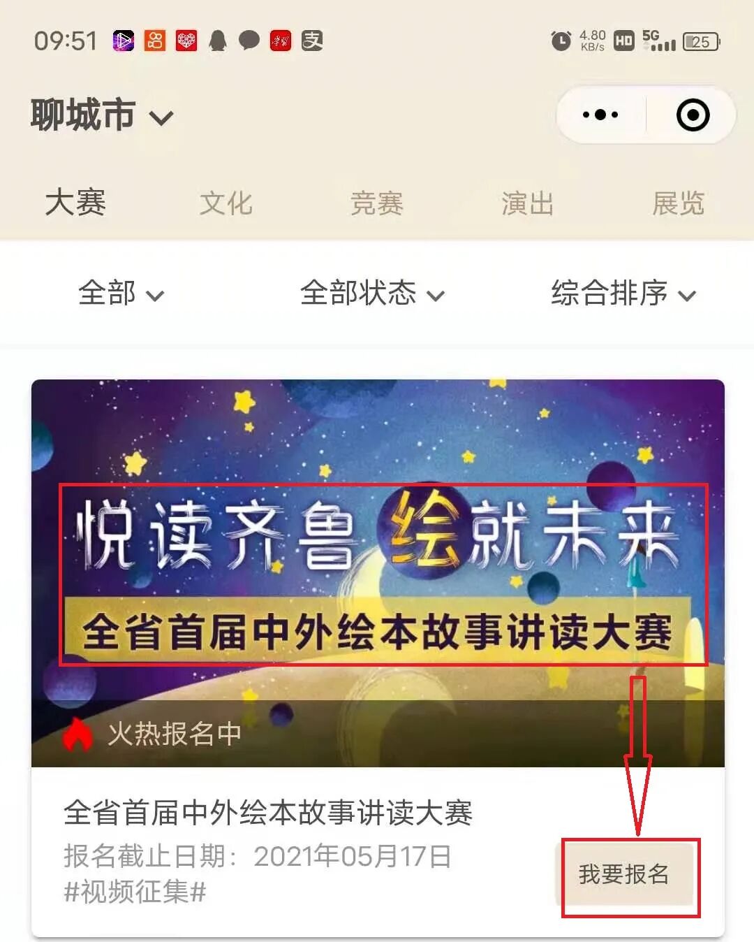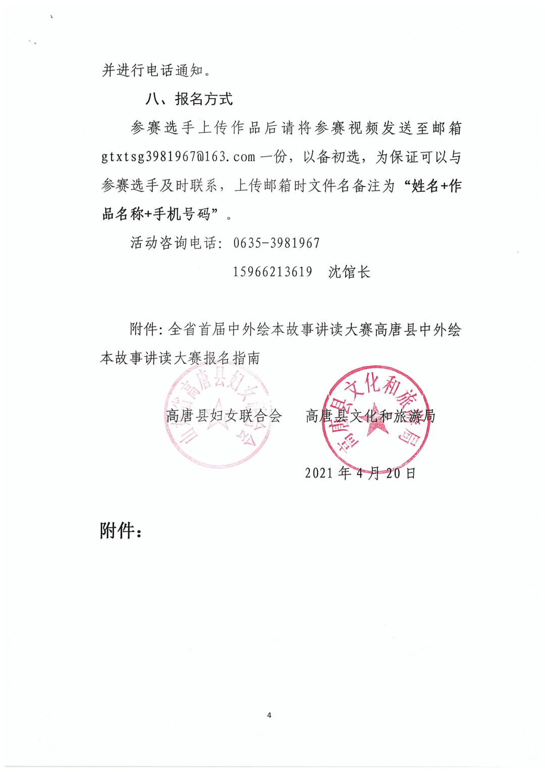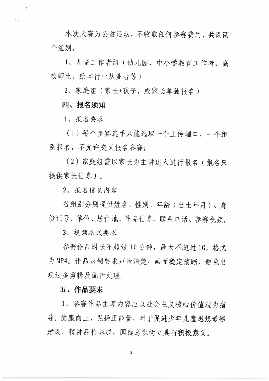 大赛简介 为深入开展“书香飘万家”家庭共成长暨家风家教主题宣传月活动,动员全县广大家庭同阅读共分享,营造家家读书、人人读书的浓厚氛围,引导广大家庭在读书中增进亲子关系、提高综合素质、传承优良家风,推动社会主义核心价值观在家庭落地落实。高唐县妇女联合会、高唐县文化和旅游局、高唐县图书馆举办“悦读齐鲁,‘绘’就未来”高唐县绘本故事讲读大赛暨全省首届中外绘本故事讲读大赛。 大赛主题 悦读齐鲁·绘就未来 组织机构 主办单位:山东省图书馆 山东省图书馆学会 承办单位:高唐县妇女联合会 高唐县文化和旅游局 协办单位:高唐县图书馆 组别设置 本次大赛为公益活动,不收取任何参赛费用,共设两个组别。 1.儿童工作者组 (幼儿园、中小学教育工作者、高校师生、绘本行业从业者等) 2.家庭组 (家长+孩子,或家长单独报名) 报名须知 1、报名要求 (1)每个参赛选手只能选取一个上传端口、一个组别报名,不允许交叉报名参赛; (2)家庭组需以家长为主讲述人进行报名(报名只提供家长信息)。 2、报名信息内容 各组别分别提供姓名、性别、年龄(出生年月)、身份证号、单位、居住地、作品信息、联系电话、参赛视频。 3、视频格式要求 参赛作品时长不超过10分钟,最大不超过1G,格式为MP4。作品录制要求声音清楚,画面稳定清晰、避免出现过多剪辑及配音处理。 作品要求 1、参赛作品主题内容应以社会主义核心价值观为指导,健康向上,弘扬正能量,对于促进少年儿童思想道德建设、精神品格养成、阅读意识树立具有积极意义。 2、参赛作品表达流畅,富有感染力,突出绘本图文并茂的特质。 3、参赛选手着装得体、拍摄背景适宜,可使用背景音乐、PPT、道具等,展现积极向上的精神风貌。 4、参赛选手可在绘本故事讲读技巧、形式上进行创意创新,鼓励讲述原创作品,并在讲读前说明。 5、参赛作品必须确保为本人讲述,严禁借用他人声音进行合成拼凑,如出现此类问题,由参赛选手本人负责相关法律责任。 6、主办方对获奖作品进行宣传、展示与交流等公益性活动中享有使用权。 赛程安排 1、报名阶段:4月20日至5月16日 2、评审阶段:5月17日至5月25日 3、发布获奖通知:5月26日至5月28日 4、决赛暨颁奖仪式:5月28日 奖项设置 本次大赛由主办方组织评审专家对参赛作品进行统一评审。 每个组别设置一等奖1名、二等奖3名、三等奖5名和优秀奖若干;颁发个人获奖证书及奖品。 获奖选手名单将会在“高唐女性”“高唐县图书馆”微信公众号公布,并进行电话通知。 报名方式 参赛选手上传作品后请将参赛视频发送至邮箱gtxtsg3981967@163.com一份,以备初选,为保证可以与参赛选手及时联系,上传邮箱时文件名备注为“姓名+作品名称+手机号码”。 活动咨询电话: 0635-3981967 15966213619 联系人:沈馆长 附件:1.关于举办高唐县绘本故事讲读大赛的通知 2.高唐县绘本故事讲读大赛报名指南 高唐县妇女联合会 高唐县文化和旅游局 2021年4月20日 附件1:关于举办高唐县绘本故事讲读大赛的通知 附件2: 高唐县绘本故事讲读大赛报名指南 第一步:扫码关注“高唐县图书馆微信公众号” 第二步:进入“高唐县图书馆微信公众平台”,点击“在线平台” 第三步:点击“汇文鲁云”进入 第四步:找到“悦读齐鲁 绘就未来”全省首届中外绘本故事讲读大赛页面点击“我要报名” 第五步:点击“立即报名”即可。