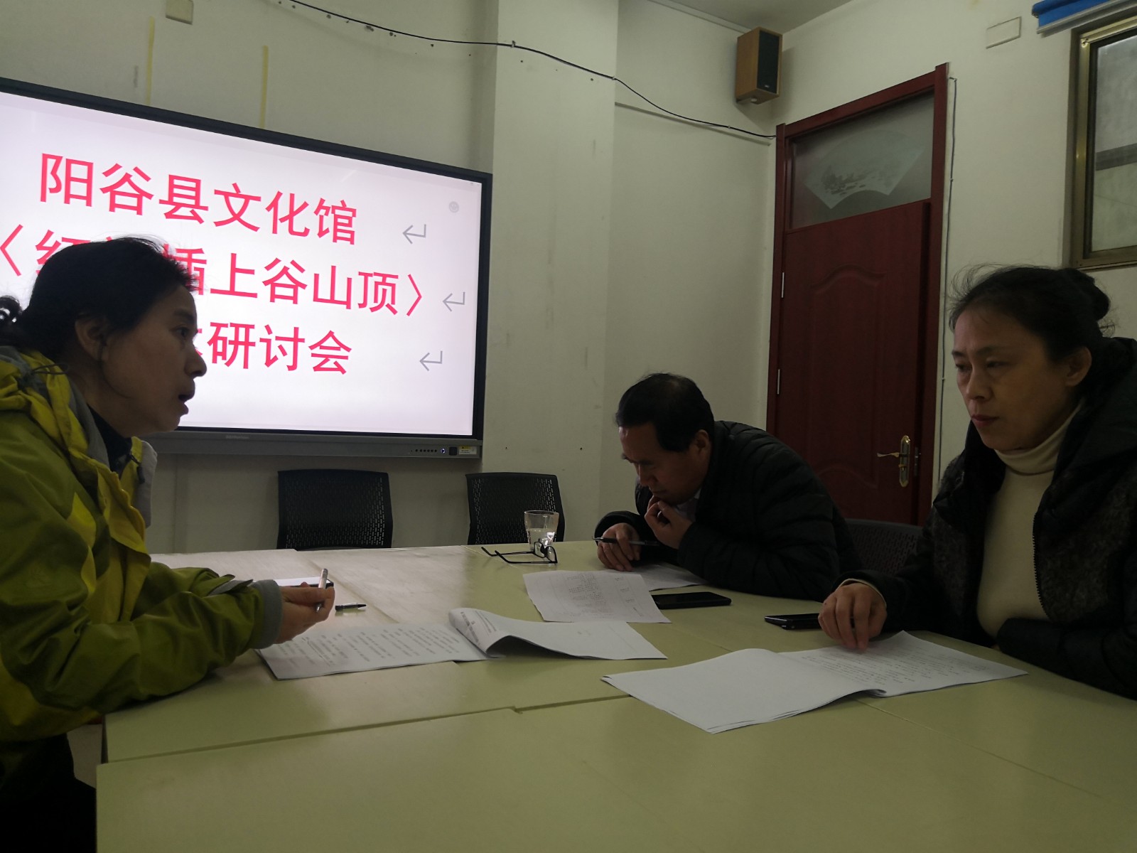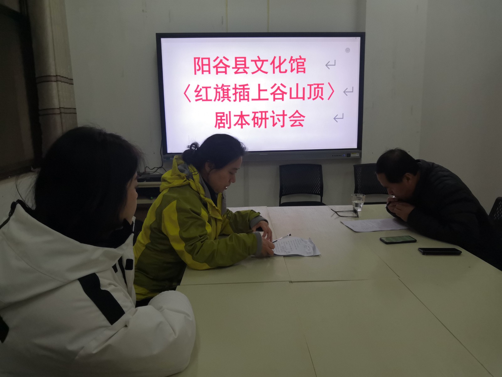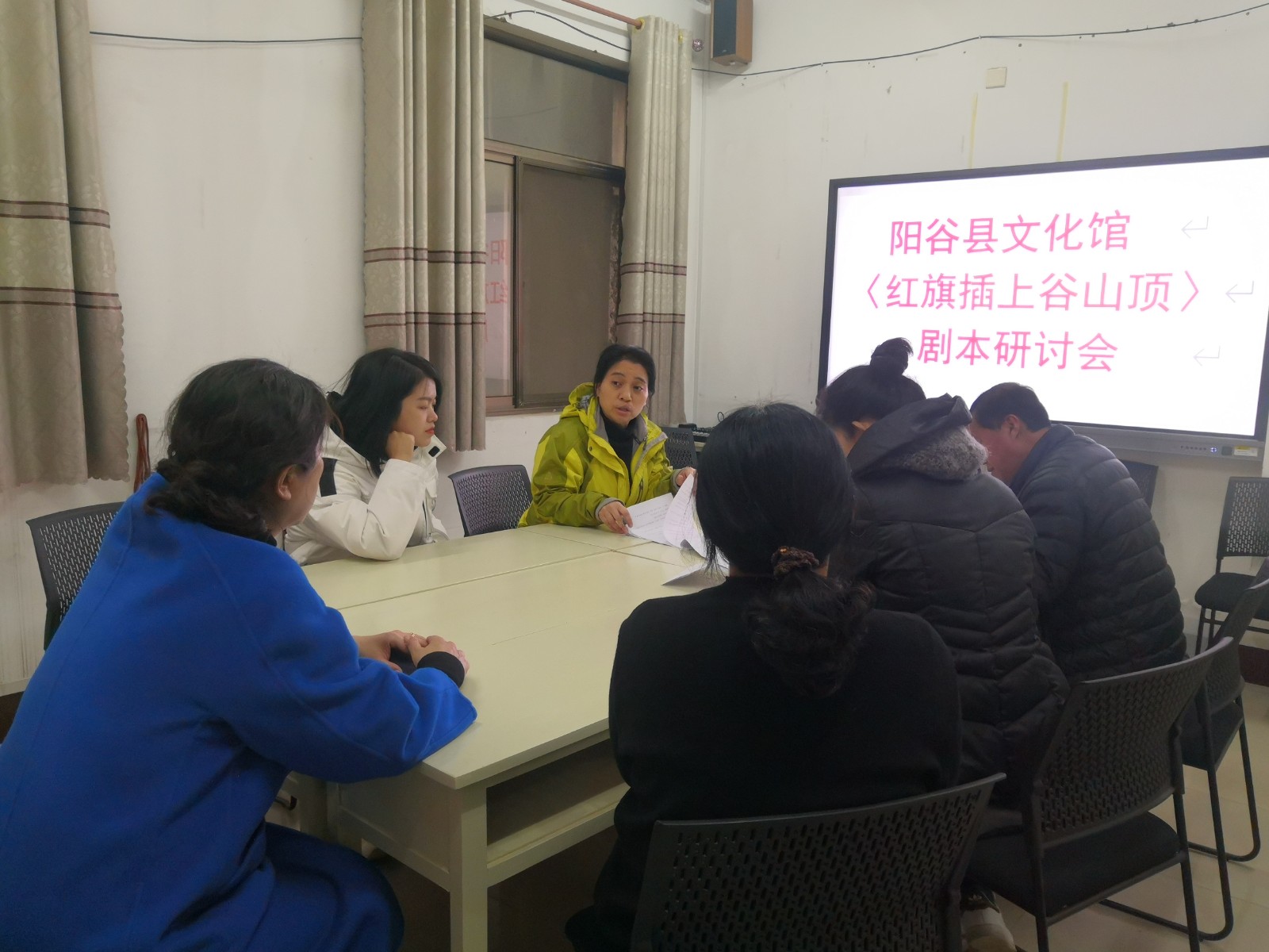 3月10日,阳谷县文化馆组织业务人员就创作作品《红旗插上谷山顶》进行剧本探讨。