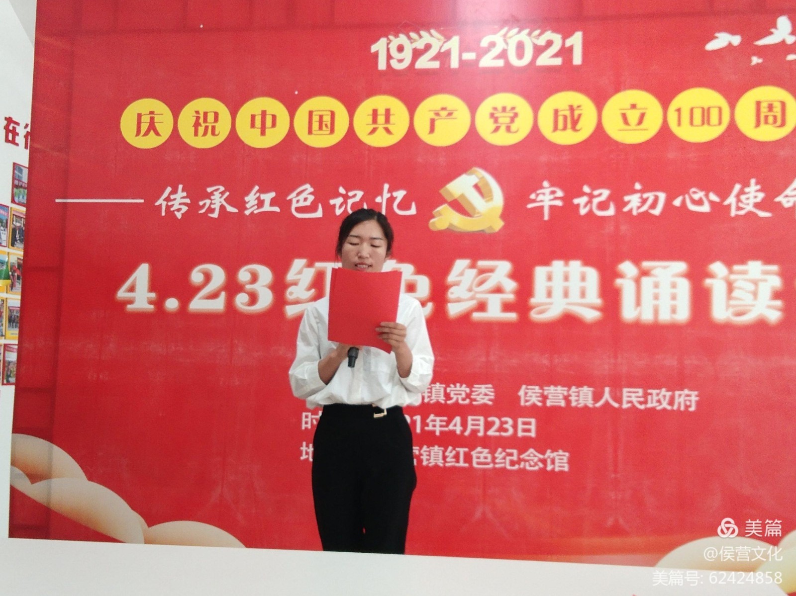 品读红色经典,感悟百年风华。2021年,中国共产党已经走过了一百年的风雨辉煌路,有着无数可歌可泣的动人篇 章,形成了一部部震撼人心的红色经典。为深入学习党史学习教育,4月23日第26个世界读书日到来之际侯营镇开展了“传承红色记忆 ,牢记初心使命”红色经典诵读活动,深情颂扬中国共产党浴血荣光,苦难辉煌的奋斗历程,回首过往奋斗路,眺望前方奋进路,进一步学习与总结党的历史,传承与发扬党的成功经验。