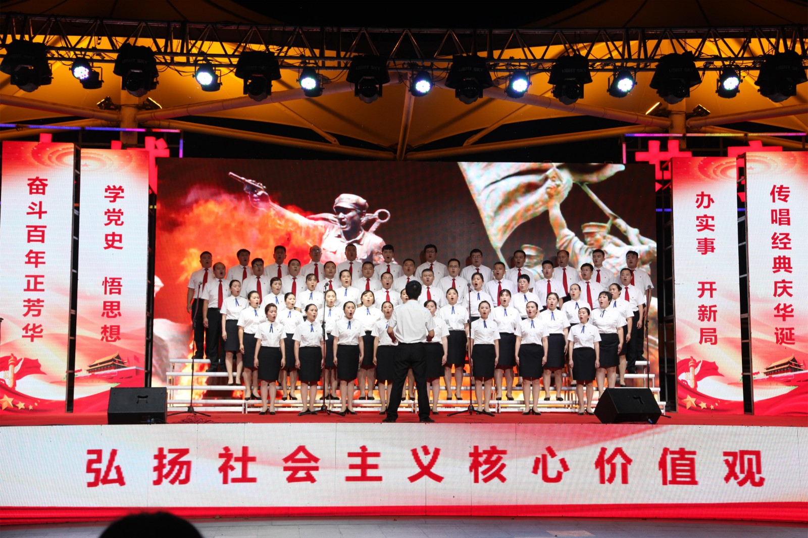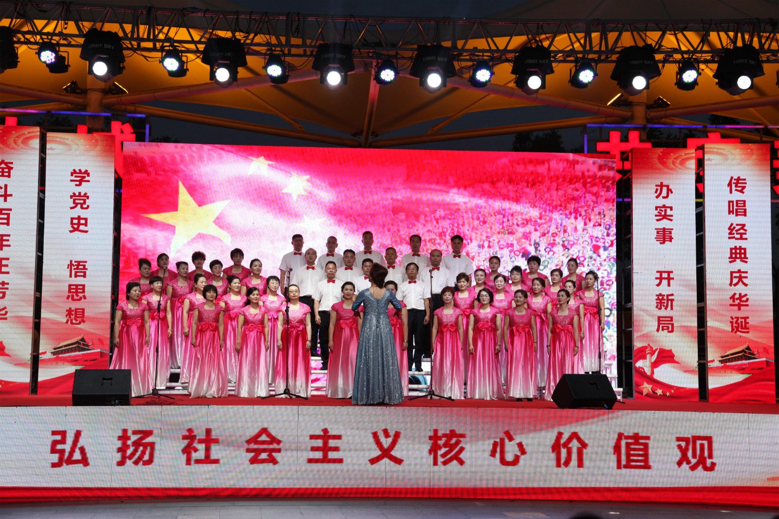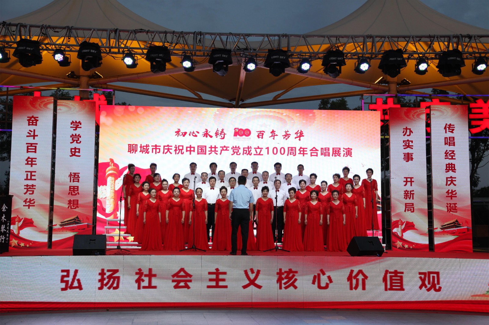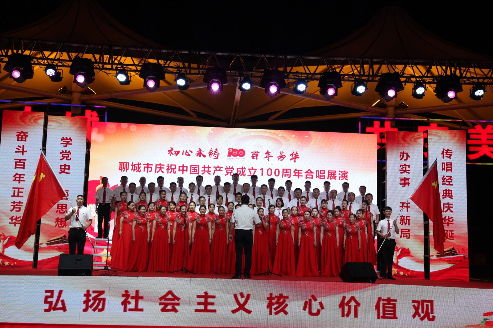 6月25日晚,由聊城市文化和旅游局主办,聊城市文化馆承办,聊城市旅游发展集团协办的“初心永铸 百年芳华”聊城市庆祝中国共产党成立100周年合唱展演在聊城水城广场举行,来自全市各县(市、区)和江北水城旅游度假区的合唱队伍在这里集中歌唱和表达对中国共产党百岁生日的祝福,讴歌我们伟大的党,歌唱我们美好的新生活,弘扬光荣的革命传统。